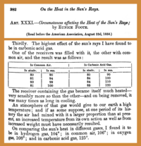 The existence of the greenhouse effect, while not named as such, was proposed as early as 1824 by Joseph Fourier.[19] The argument and the evidence were further strengthened by Claude Pouillet in 1827 and 1838. In 1856 Eunice Newton Foote demonstrated that the warming effect of the sun is greater for air with water vapour than for dry air, and the effect is even greater with carbon dioxide. She concluded that "An atmosphere of that gas would give to our earth a high temperature..."[20][21]