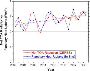 Earth's top-of-atmosphere (TOA) energy imbalance (EEI) is the amount by which the power of incoming radiation exceeds the power of outgoing radiation:[54]