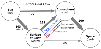 | Greenhouse effect, [math]\displaystyle{ G }[/math] | 16000 W/m2 | 150 W/m2 | 13 W/m2 | 2.8 W/m2 GHE; 1.9 W/m2 GHE+AGHE |