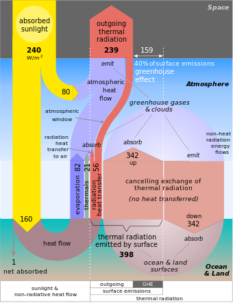 Thermal radiation is characterized by how much energy it carries, typically in watts per square meter (W/m2). Scientists also measure the greenhouse effect based on how much more longwave thermal radiation leaves the Earth's surface than reaches space.[26]:968[26]:934[27][28][29] Currently, longwave radiation leaves the surface at an average rate of 398 W/m2, but only 239 W/m2 reaches space. Thus, the Earth's greenhouse effect can also be measured as an energy flow change of 159 W/m2.[26]:968[26]:934 The greenhouse effect can be expressed as a fraction (0.40) or percentage (40%) of the longwave thermal radiation that leaves Earth's surface but does not reach space.[26]:968[27][30]