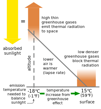 Rather than thinking of longwave radiation headed to space as coming from the surface itself, it is more realistic to think of this outgoing radiation as being emitted by a layer in the mid-troposphere, which is effectively coupled to the surface by a lapse rate. The difference in temperature between these two locations explains the difference between surface emissions and emissions to space, i.e., it explains the greenhouse effect.[64][65]