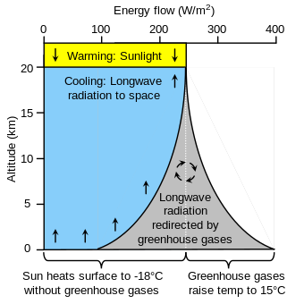 The term greenhouse effect comes from an analogy to greenhouses. Both greenhouses and the greenhouse effect work by retaining heat from sunlight, but the way they retain heat differs. Greenhouses retain heat mainly by blocking convection (the movement of air).[16][17] In contrast, the greenhouse effect retains heat by restricting radiative transfer through the air and reducing the rate at which heat escapes to space.[5]