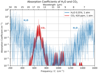Different substances are responsible for reducing the radiation energy reaching space at different frequencies; for some frequencies, multiple substances play a role.[28] Carbon dioxide is understood to be responsible for the dip in outgoing radiation (and associated rise in the greenhouse effect) at around 667 cm−1 (equivalent to a wavelength of 15 microns).[46]