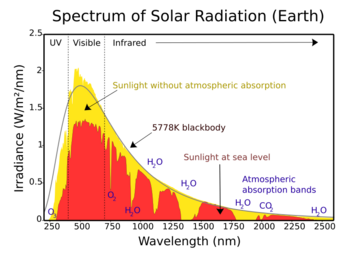 Hotter matter emits shorter wavelengths of radiation. As a result, the Sun emits shortwave radiation as sunlight while the Earth and its atmosphere emit longwave radiation. Sunlight includes ultraviolet, visible light, and near-infrared radiation.[15]:2251