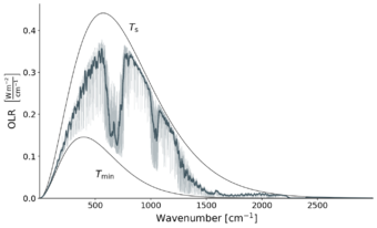 The greenhouse effect can be directly seen in graphs of Earth's outgoing longwave radiation as a function of frequency (or wavelength). The area between the curve for longwave radiation emitted by Earth's surface and the curve for outgoing longwave radiation indicates the size of the greenhouse effect.[29]