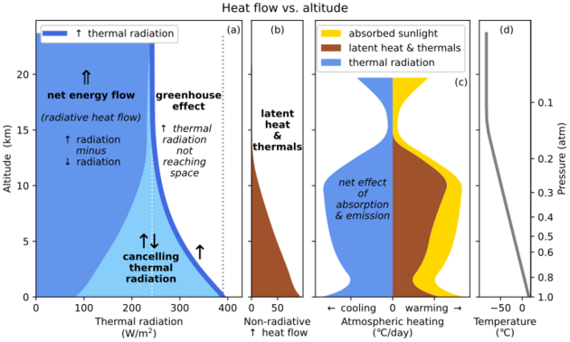 Effect on surface cooling: Longwave radiation flows both upward and downward due to absorption and emission in the atmosphere. These canceling energy flows reduce radiative surface cooling (net upward radiative energy flow). Latent heat transport and thermals provide non-radiative surface cooling which partially compensates for this reduction, but there is still a net reduction in surface cooling, for a given surface temperature.[51]:139[68]