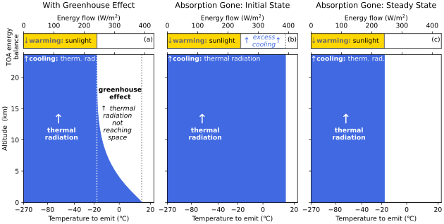 This approach is less accurate than accounting for variation in radiation wavelength by emission altitude. However, it can be useful in supporting a simplified understanding of the greenhouse effect.[81] For instance, it can be used to explain how the greenhouse effect increases as the concentration of greenhouse gases increase.[83][82][65]
