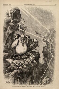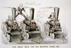 One of the most hated railroad men in the country was Collis P. Huntington (1821–1900), the president of the Southern Pacific Railroad, who dominated California's economy and politics. One textbook argues: "Huntington came to symbolize the greed and corruption of late-nineteenth-century business. Business rivals and political reformers accused him of every conceivable evil. Journalists and cartoonists made their reputations by pillorying him.... Historians have cast Huntington as the state's most despicable villain."[38] However Huntington defended himself: "The motives back of my actions have been honest ones and the results have redounded far more to the benefit of California than they have to my own."[39]