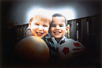 | Acute angle closure glaucoma of the person's right eye (shown at left). Note the mid-sized pupil, which was non-reactive to light, and redness of the white part of the eye. | |