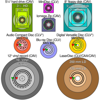DVD recordable and rewritable discs can be read and written using either constant angular velocity (CAV), constant linear velocity (CLV), Partial constant angular velocity (P-CAV) or Zoned Constant Linear Velocity (Z-CLV or ZCLV).[73]