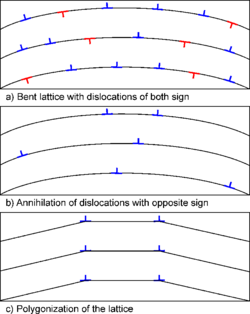 Each dislocation is associated with a strain field which contributes some small but finite amount to the materials stored energy. When the temperature is increased - typically below one-third of the absolute melting point - dislocations become mobile and are able to glide, cross-slip and climb. If two dislocations of opposite sign meet then they effectively cancel out and their contribution to the stored energy is removed. When annihilation is complete then only excess dislocation of one kind will remain.