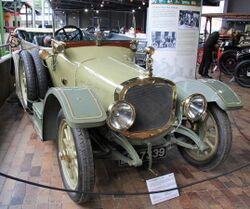 Louis Coatalen in the Nautilus at Brooklands in 1910 Coatalen was particularly fond of racing as a way to drive excellence noting that "Racing improves the breed".[10] After designing his 14/20 he began to design advanced high-power engines combining overhead valves with a pressurised oil lubrication system. In 1910 he built Sunbeam Nautilus, his first dedicated land-speed-record car, powered by a 4.2-litre version of this engine design. The Nautilus implemented a number of early "wind cutting" or streamlining features but the specially-built engine suffered various problems and eventually the engine design was abandoned. The next year he made Sunbeam Toodles II featuring an improved valve system that made the Nautilus engine a success. Coatalen won 22 prizes in Toodles II at Brooklands in 1911 and also achieved a flying mile of 86.16 mph (138.66 km/h) to take the 16 hp Short Record. Sunbeam cars powered by more conventional (for the time) side-valve engines featured prominently in the 1911 Coupe de l'Auto race, and improved versions won first, second and third the next year. Sunbeams continued to race over the next few years, but its management had moved on to other interests. |