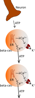 Pulsatile insulin release from the entire pancreas requires that secretion is synchronized between 1 million islets within a 25 cm long organ. Much like the cardiac pacemaker, the pancreas is connected to cranial nerve 10, and others, but the oscillations are accomplished by intrapancreatic neurons and do not require neural input from the brain. It is not entirely clear which neural factors account for this synchronization but ATP as well as the gasses NO and CO may be involved.[1] The effect of these neural factors is to induce sudden dramatic elevation of calcium in the cytoplasm by releasing calcium from the endoplasmic reticulum (ER) of the beta cells. This elevation results in release of ATP from the beta cells. The released ATP in turn binds to receptors on neighbouring beta cells leading to a regenerative wave of rapid calcium elevation among the cells within the islet. This signal is believed to entrain pulsatile insulin release from the islets into a common pancreatic rhythm.[1]