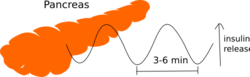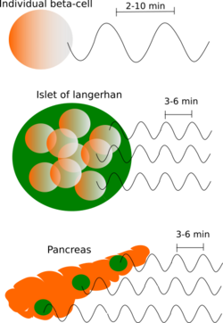 The insulin concentration in blood increases after meals and gradually returns to basal levels during the next 1–2 hours. However, the basal insulin level is not stable. It oscillates with a regular period of 3-6 min. After a meal the amplitude of these oscillations increases but the periodicity remains constant.[1] The oscillations are believed to be important for insulin sensitivity by preventing downregulation of insulin receptors in target cells.[1] Such downregulation underlies insulin resistance, which is common in type 2 diabetes. It would therefore be advantageous to administer insulin to diabetic patients in a manner mimicking the natural oscillations.[1] The insulin oscillations are generated by pulsatile release of the hormone from the pancreas. Insulin originates from beta cells located in the islets of Langerhans. Since each islet contains up to 2000 beta cells and there are one million islets in the pancreas it is apparent that pulsatile secretion requires sophisticated synchronization both within and among the islets of Langerhans.