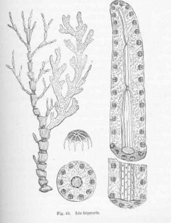 Isis hippuris, also known as sea bamboo, is a species of bamboo coral found in the Western Pacific Ocean, commonly near the coasts of Indonesia.[1] I. hippuris reproduce asexually, and is abundant throughout its habitats in Indonesia. For centuries, I. hippuris has been identified by its bamboo or bony-looking structure. Additionally, it is notable for producing Hippuristanol, a molecule that could potentially have anti-cancer applications. While no actual conclusion regarding Hippuristanol in I. hippuris has been published, scientists and marine biologists continue to study how the molecule could be used in cancer research and recovery.[2] Although only found in the Western Pacific Ocean, I. hippuris is highly sought after across the globe, and is seen as a symbol of beauty.[3]