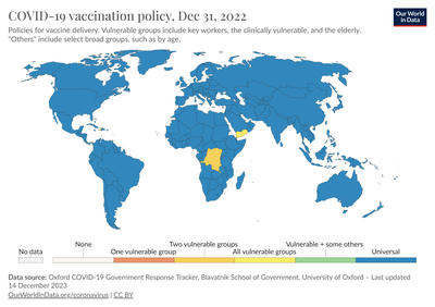 Vaccinations started on 19 April, initially with 1.7 million doses of the Covishield vaccine supplied through the COVAX mechanism.[33] After administering only 1700 doses in the first week of the vaccination campaign, health officials announced that 1.3 million doses would be returned for redistribution to other countries (495,000 to Angola, 350,000 to Ghana, 250,000 to Madagascar, 140,000 to Togo and 80,000 to the Central African Republic).[34]