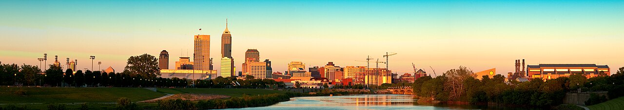 A 2009 panorama of the Downtown Indianapolis skyline and White River at twilight