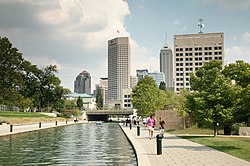 A 2009 panorama of the Downtown Indianapolis skyline and White River in daylight