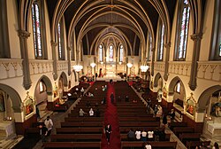 Indianapolis is home to roughly 1,200 congregations representing numerous faiths, including some 100 Christian denominations.[174] Some of the city’s oldest congregations include Meridian Street United Methodist Church (1821),[175] Central Christian Church (1833),[176] Bethel A.M.E. Church (1836),[177] Christ Church Cathedral (1837),[178] St. John the Evangelist Catholic Church (1837),[179] Second Presbyterian Church (1838),[180] and the Indianapolis Hebrew Congregation (1856).[181] Newer establishments reflect the city’s growing religious diversity, including Masjid Al Mu'mineen (2001), the Hindu Temple of Central Indiana (2006),[182] and the Indianapolis Indiana Temple (2015), located in Carmel.[183] The First Church of Cannabis was established in response to Indiana’s Religious Freedom Restoration Act in 2015.[172]