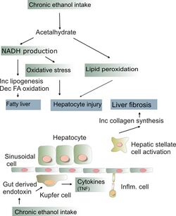 Alcoholic hepatitis is distinct from cirrhosis caused by long-term alcohol consumption. Alcoholic hepatitis can occur in patients with chronic alcoholic liver disease and alcoholic cirrhosis. Alcoholic hepatitis by itself does not lead to cirrhosis, but cirrhosis is more common in patients with long term alcohol consumption.[6] Some alcoholics develop acute hepatitis as an inflammatory reaction to the cells affected by fatty change.[6] This is not directly related to the dose of alcohol. Some people seem more prone to this reaction than others. This inflammatory reaction to the fatty change is called alcoholic steatohepatitis and the inflammation probably predisposes to liver fibrosis by activating hepatic stellate cells to produce collagen.[6]