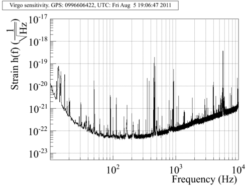Virgo is a wide band detector whose sensitivity ranges from a few Hz up to 10 kHz. Mathematically speaking, its sensitivity is characterized by its power spectrum which is computed in real time using the data recorded by the detector. The curve opposite shows an example of a Virgo amplitude spectrum density (the square root of the power spectrum) from 2011, plotted using log-log scale.