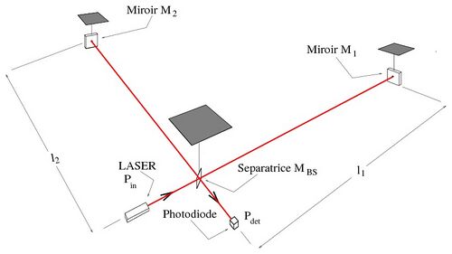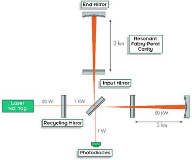 The optimal working point of an interferometric detector of gravitational waves is slightly detuned from the "dark fringe", a configuration in which the two laser beams recombined on the beam splitter interfere in a destructive way: almost no light is detected at the output port. Calculations show that the detector sensitivity scales as[14] [math]\displaystyle{ \frac{1}{L\times\sqrt{P}} }[/math], where [math]\displaystyle{ L }[/math] is the arm cavity length and [math]\displaystyle{ P }[/math] the laser power on the beam splitter. To improve it, these two quantities must be increased.