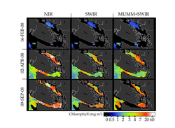 To map algal blooms thresholding is used in combination with a spectral index like the Normalized Difference Vegetation Index (NDVI). In one observation the intensity and location of the algal bloom can be recorded, and with a second observation at a different time the displacement and intensity change of the algal bloom can be tracked. Algal blooms are used to study internal wave structures, up-welling and river outflows,[21] which all bring nutrients to surface waters, since they are correlated with algae concentration . Pollution often coincides with high nutrient waters, making algal blooms good indicators for the severity and impact of water pollution[22]