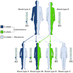 For example, the blood type of humans is determined by the ABO gene which encodes variants of an enzyme that creates the A, B, AB, or O blood type located on the long or q arm of chromosome nine (9q34.2).[7] three different alleles could be present at this locus, but only two can be present in any individual, one inherited from their mother and one from their father.[8]