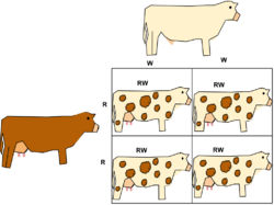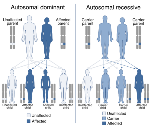 In genetics, dominance is the phenomenon of one variant (allele) of a gene on a chromosome masking or overriding the effect of a different variant of the same gene on the other copy of the chromosome.[1][2] The first variant is termed dominant and the second is called recessive. This state of having two different variants of the same gene on each chromosome is originally caused by a mutation in one of the genes, either new (de novo) or inherited. The terms autosomal dominant or autosomal recessive are used to describe gene variants on non-sex chromosomes (autosomes) and their associated traits, while those on sex chromosomes (allosomes) are termed X-linked dominant, X-linked recessive or Y-linked; these have an inheritance and presentation pattern that depends on the sex of both the parent and the child (see Sex linkage). Since there is only one copy of the Y chromosome, Y-linked traits cannot be dominant or recessive. Additionally, there are other forms of dominance, such as incomplete dominance, in which a gene variant has a partial effect compared to when it is present on both chromosomes and co-dominance, in which different variants on each chromosome both show their associated traits.