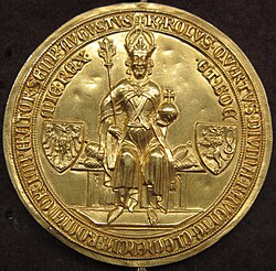 While the burghers were on their way up, the empire itself seemed to be on the way out, since election disputes continuously ended up spiraling into violence. It also wasn't even clear who the electors were and what rights they had, and of course, the door was always open for the pope to start meddling again. In the hopes of rectifying these problems, newly-elected emperor Charles IV assembled the princes of the empire in 1355. They negotiated the Golden Bull, which Charles promulgated in 1356, a decree which effectively served as the empire's constitution by clarifying its institutions.[60] The real winners, though, were the seven electors now confirmed by the document, as in exchange for their loyalty they won even more autonomy. The Golden Bull, for the most part, finally managed to cut the fucking pope out of the empire's succession business. Of course, that wouldn't be the end of the empire's religious problems. Not by a long shot.