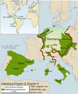 Freddy 3's son, Maximillian, succeeded him in 1508, and his reign began with a significant lessening of papal authority over the empire. Due to ongoing wars, he was unable to travel to Rome to be crowned by the pope, so he simply decided that he would be Holy Roman Emperor without that ceremonial step.[63] The requirement for papal involvement in crowning emperors became weaker and weaker until its abandonment in 1530. Fuck you, pope. Maximillian also saw the Hapsburgs expand their domain by marrying into Spain's royal family and then inheriting the kingdom along with its vast colonial empire. By the time Charles V took the throne, his domains were considered "the empire on which the sun never sets".[64]