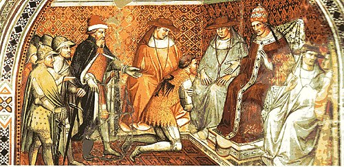 In 1075, Pope Gregory VII composed the "Dictatus Papae", which declared that the papacy was the sole universal authority and had the legal power to remove the Holy Roman Emperor.[32] Henry IV, who had grown into an adult by this time, retaliated by publicly withdrawing his support for the pope. The emperor then got all of his loyal bishops to excommunicate the pope, notably and insultingly referring to the pontiff by his birth name "Hildebrand" rather than his papal name.[33] The pope retaliated with one of the most effective instances of "no u" in history, excommunicating Henry IV and declaring that he was no longer the Holy Roman Emperor.[32]