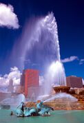 The Buckingham Fountain in Grant Park in Chicago was one of the first American fountains to use powerful modern pumps to shoot water as high as 150 feet (46 meters) into the air. The Fountain of Prometheus, built at the Rockefeller Center in New York City in 1933, was the first American fountain in the Art-Deco style.