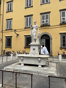 One of the first new fountains to be built in Rome during the Renaissance was the fountain in the piazza in front of the church of Santa Maria in Trastevere (1472), which was placed on the site of an earlier Roman fountain. Its design, based on an earlier Roman model, with a circular vasque on a pedestal pouring water into a basin below, became the model for many other fountains in Rome, and eventually for fountains in other cities, from Paris to London.[26]