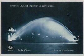 The great international expositions held in Philadelphia, London and Paris featured the ancestors of the modern musical fountain. They introduced the first fountains illuminated by gas lights (Philadelphia in 1876); and the first fountains illuminated by electric lights (London in 1884 and Paris in 1889).[59] The Exposition Universelle (1900) in Paris featured fountains illuminated by colored lights controlled by a keyboard.[60] The Paris Colonial Exposition of 1931 presented the Théâtre d'eau, or water theater, located in a lake, with performance of dancing water. The Exposition Internationale des Arts et Techniques dans la Vie Moderne (1937) had combined arches and columns of water from fountains in the Seine with light, and with music from loudspeakers on eleven rafts anchored in the river, playing the music of the leading composers of the time. (See International Exposition Fountains, above.)