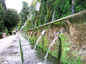 The Romans were able to make fountains jet water into the air, by using the pressure of water flowing from a distant and higher source of water to create hydraulic head, or force. Illustrations of fountains in gardens spouting water are found on wall paintings in Rome from the 1st century BC, and in the villas of Pompeii.[7] The Villa of Hadrian in Tivoli featured a large swimming basin with jets of water. Pliny the Younger described the banquet room of a Roman villa where a fountain began to jet water when visitors sat on a marble seat. The water flowed into a basin, where the courses of a banquet were served in floating dishes shaped like boats.[8]