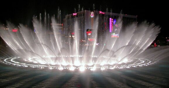 The musical fountain of the Bellagio Hotel & Casino in Las Vegas, with pivoting nozzles to vary the patterns of the water, controlled by computers and accompanied by music (1998)
