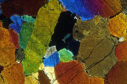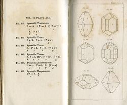 Nicholas Steno first observed the law of constancy of interfacial angles (also known as the first law of crystallography) in quartz crystals in 1669.[5]:4 This was later generalized and established experimentally by Jean-Baptiste L. Romé de l'Islee in 1783.[6] René Just Haüy, the "father of modern crystallography", showed that crystals are periodic and established that the orientations of crystal faces can be expressed in terms of rational numbers, as later encoded in the Miller indices.[5]:4 In 1814, Jöns Jacob Berzelius introduced a classification of minerals based on their chemistry rather than their crystal structure.[7] William Nicol developed the Nicol prism, which polarizes light, in 1827–1828 while studying fossilized wood; Henry Clifton Sorby showed that thin sections of minerals could be identified by their optical properties using a polarizing microscope.[5]:4[7]:15 James D. Dana published his first edition of A System of Mineralogy in 1837, and in a later edition introduced a chemical classification that is still the standard.[5]:4[7]:15 X-ray diffraction was demonstrated by Max von Laue in 1912, and developed into a tool for analyzing the crystal structure of minerals by the father/son team of William Henry Bragg and William Lawrence Bragg.[5]:4