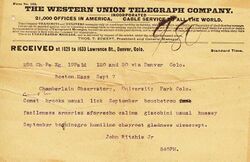 In 1866, Western Union acquired the American Telegraph Company and the United States Telegraph Company, its two main competitors, for a time gaining a virtual monopoly over the American telegraphy industry.[13] The company also began to develop new telegraphy-related services beyond the transmission and delivery of telegrams, launching the first stock ticker in 1866,[15] a standardized time service in 1870 and wire money transfer in 1871.[16]