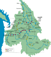 While the many dams in the Snake River basin have transformed the region's economy, they have also had an adverse environmental effect on wildlife, most notably on wild salmon migrations.[14] Since the 1990s, some conservation organizations and fishermen are seeking to restore the lower Snake River and Snake River salmon and steelhead by removing four federally-owned dams on the lower Snake River.[15]