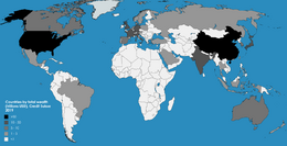 The China–United States trade war, starting in 2018, negatively affected trade between the two largest national economies. The economic impact of the COVID-19 pandemic included a massive decline in tourism and international business travel as many countries temporarily closed borders. The 2021–2022 global supply chain crisis resulted from temporary shutdowns of manufacturing and transportation facilities, and labor shortages. Supply problems incentivized some switches to domestic production.[56] The economic impact of the 2022 Russian invasion of Ukraine included a blockade of Ukrainian ports and international sanctions on Russia, resulting in some de-coupling of the Russian economy with global trade, especially with the European Union and other Western countries.