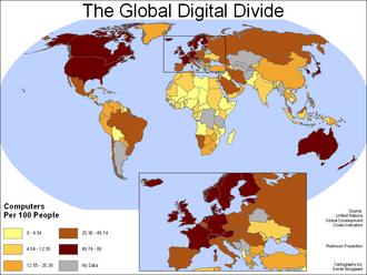 The global justice movement is the loose collection of individuals and groups—often referred to as a "movement of movements"—who advocate fair trade rules and perceive current institutions of global economic integration as problems.[199] The movement is often labeled an anti-globalization movement by the mainstream media. Those involved, however, frequently deny that they are anti-globalization, insisting that they support the globalization of communication and people and oppose only the global expansion of corporate power.[200] The movement is based in the idea of social justice, desiring the creation of a society or institution based on the principles of equality and solidarity, the values of human rights, and the dignity of every human being.[201][202][203] Social inequality within and between nations, including a growing global digital divide, is a focal point of the movement. Many nongovernmental organizations have now arisen to fight these inequalities that many in Latin America, Africa and Asia face. A few very popular and well known non-governmental organizations (NGOs) include: War Child, Red Cross, Free The Children and CARE International. They often create partnerships where they work towards improving the lives of those who live in developing countries by building schools, fixing infrastructure, cleaning water supplies, purchasing equipment and supplies for hospitals, and other aid efforts.