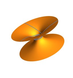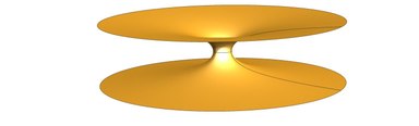 The Ellis wormhole is the special case of the Ellis drainhole in which the 'ether' is not flowing and there is no gravity. What remains is a pure traversable wormhole comprising a pair of identical twin, nonflat, three-dimensional regions joined at a two-sphere, the 'throat' of the wormhole. As seen in the image shown, two-dimensional equatorial cross sections of the wormhole are catenoidal 'collars' that are asymptotically flat far from the throat. There being no gravity in force, an inertial observer (test particle) can sit forever at rest at any point in space, but if set in motion by some disturbance will follow a geodesic of an equatorial cross section at constant speed, as would also a photon. This phenomenon shows that in space-time the curvature of space has nothing to do with gravity (the 'curvature of time’, one could say).
