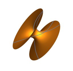 which describes a 'hypercone' with its vertex at the singular point, its latitude circles of geodesic radius [math]\displaystyle{ \rho }[/math] having circumferences [math]\displaystyle{ \textstyle 2 \pi r(0,\rho) = 2 \pi \sqrt{1 + a^2} \rho \, . }[/math] Unlike the catenoid, neither the hypercatenoid nor the hypercone is fully representable as a surface in euclidean three-space; only the portions where [math]\displaystyle{ \textstyle |dr(t,\rho)/d\rho| = (1 + a^2) |\rho|\big/\sqrt{(1 + a^2)\rho^2 + a^2 c^2 t^2} \leq 1 }[/math] (thus where [math]\displaystyle{ \textstyle |\rho| \leq c |t|\big/\sqrt{1 + a^2} }[/math] or equivalently [math]\displaystyle{ \textstyle r(t,\rho) \leq \sqrt{1 + a^2} c |t| }[/math]) can be embedded in that way.
