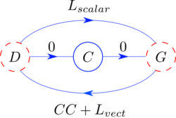 DCG chart: A simple chart depicting all rules pertaining to second derivatives. D, C, G, L and CC stand for divergence, curl, gradient, Laplacian and curl of curl, respectively. Arrows indicate existence of second derivatives. Blue circle in the middle represents curl of curl, whereas the other two red circles (dashed) mean that DD and GG do not exist.