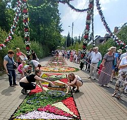In Spycimierz in central Poland (Gmina Uniejów), parishioners arrange a carpet of live flowers about one kilometre long. A solemn procession passes over it at 5 pm. [44] Long carpets of flowers are also laid in four parishes in the Opole Voivodship in southern Poland. Flower carpets tradition for Corpus Christi processions was inscribed on the UNESCO Representative List of the Intangible Cultural Heritage of Humanity in 2021. [45]