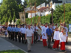 Throughout Christendom, "the custom developed of carrying the Blessed Sacrament in a splendid procession through the town after the Mass on Corpus Christi Day."[6] The monstrance which holds the host is surrounded by a Corpus Christi wreath of flowers.[6] During the procession, church bells are rung and "the faithful kneel in front of their homes to adore the Eucharistic Lord."[6] Along the route in which the procession occurs, Christian homes "are decorated with little birch trees and green boughs", with candles being lit in the windows.[6] Oftentimes, stops are made at various points called "stations" during the procession and "the Blessed Sacrament is put on an altar table" while a Gospel passage is read and hymns are sung, along with prayer being made.[6]