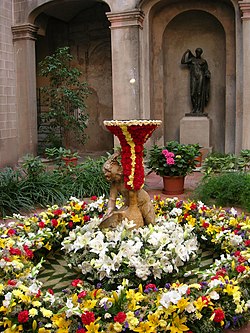 On the eve of the Feast of Corpus Christi, clergy bless Corpus Christi wreaths that are made of flowers.[6] Corpus Christi wreaths and bouquets are often "attached to flags and banners, to houses, and to the arches of green boughs that span the streets."[6] In Christian homes, these Corpus Christi wreaths are suspended on walls or displayed on doors and in windows.[6] Corpus Christi wreaths are also "put up in gardens, fields, and pastures, with a prayer for protection and blessing upon the growing harvest."[6]