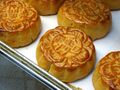 Mooncakes with Chinese characters 金門旦黃 (jinmen danhuang).