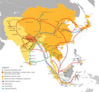 Buddhist expansion in Asia: Mahayana Buddhism first entered the Chinese Empire (Han dynasty) through Silk Road during the Kushan Era. The overland and maritime "Silk Roads" were interlinked and complementary, forming what scholars have called the "great circle of Buddhism".